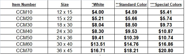 STANDARD COLORS: black, royal, navy, scarlet, gold, kelly, orange, gray, cardinal, purple, dk. green, sky blue SPECIAL COLORS: fuchsia, fluorescent orange, fluorescent pink, fluorescent lime, fluorescent yellow |